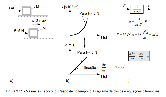 Para o caso mostrado na figura 3.11, ao aplicar uma força externa de 5 N está sendo provocada uma aceleração de 2 m/s2, de modo que o deslocamento fique cada vez maior. Novamente o diagrama de blocos é equivalente à equação apresentada logo abaixo deste e descreve que o deslocamento (saída) decorre da dupla integração da força (entrada) aplicada sobre a massa.