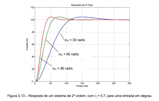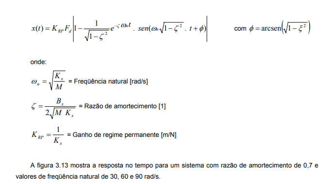 O diagrama de blocos e as equações presentes na figura 3.12b modelam implicitamente o comportamento do sistema. Para que se possa observar como este responde no tempo para um determinado tipo de entrada é necessário encontrar a solução da equação diferencial. Para o caso de uma entrada em degrau, uma possível solução (válida para –1 < ξ < 1) é dada pela expressão abaixo: