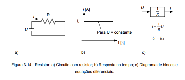Na figura 3.14c está representado o diagrama de blocos expressando que se aplicando uma diferença de tensão (entrada) há a passagem de corrente (saída) pelo resistor. A equação escrita abaixo do diagrama de blocos é a forma matemática de representar este comportamento, estabelecendo a relação entre a tensão e a corrente dependente da resistência. Invertendo-se equação, pode-se determinar qual a tensão necessária para haja uma determinada corrente no circuito.