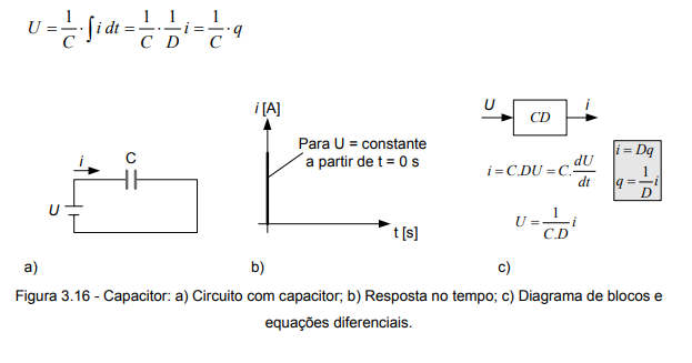 Por sua vez, ao aplicar um degrau em tensão em um capacitor (figura 3.16) a corrente instantaneamente é máxima e reduz-se para zero em função do capacitor isolar o circuito quando carregado. Se a fonte de tensão for desligada e o polo positivo do capacitor for conectado ao terra haverá um pico de corrente no sentido oposto, descarregando o capacitor. O diagrama de blocos e a equação equivalente apresentados na figura 3.16c descrevem este fenômeno.