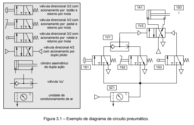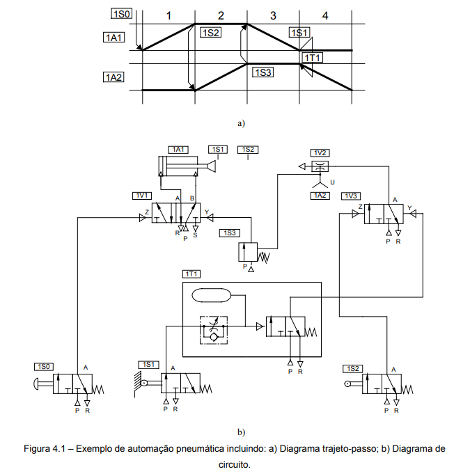A figura 4.1 ilustra uma automação pneumática (comando pneumático) através de seu diagrama de circuito e do diagrama trajeto-passo correspondente.