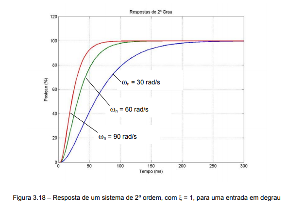 A figura 3.18 mostra a resposta no tempo para um sistema com razão de amortecimento de 1 e valores de frequência natural de 30, 60 e 90 rad/s.