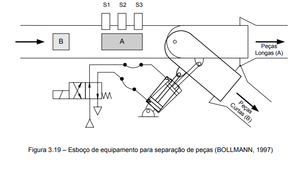 Considera-se como exemplo uma esteira de transporte de peças (figura 3.19) onde são movimentadas peças longas e curtas numa sequência aleatória. A plataforma articulada é movimentada pelo cilindro pneumático de modo a separar as peças longas e curtas. Três sensores (S1, S2 e S3) são usados para detectar o comprimento das peças: para uma peça longa haverá um curto espaço de tempo em que os três sensores estarão simultaneamente acionados; no caso de uma peça curta, haverá um pequeno instante em que apenas S2 estará acionado.