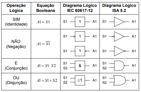 O comportamento a eventos discretos deste sistema pode ser descrito utilizando a álgebra Booleana cujas operações lógicas básicas são: ‘SIM’, ‘NÃO’, ‘E’ e ‘OU’. A tabela 3.1 apresenta, para cada uma destas operações lógicas, a equação Booleana, o diagrama lógico segundo a IEC 60617-12 (IEC, 1997) e o diagrama lógico segundo a ISA 5.2 (ISA, 1992).