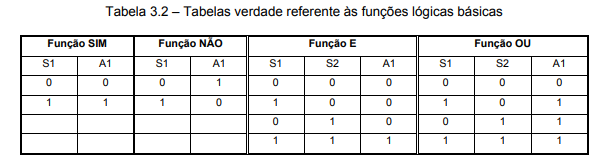 Conforme mostrado na tabela 3.2, a interpretação das operações lógicas ocorre através da tabela verdade que explicita os valores (0 ou 1) da variável de saída em função de todas as combinações possíveis de valores das varáveis de entrada.