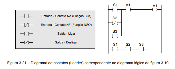 Uma ferramenta bastante empregada na programação de controladores lógico programáveis (CLP) é o diagrama de escada (ou diagrama de contatos ou Ladder Diagram), que equivale à equação Booleana e ao diagrama lógico. Na figura 3.21 está apresentado o diagrama de escada referente ao equipamento de separação de peças.