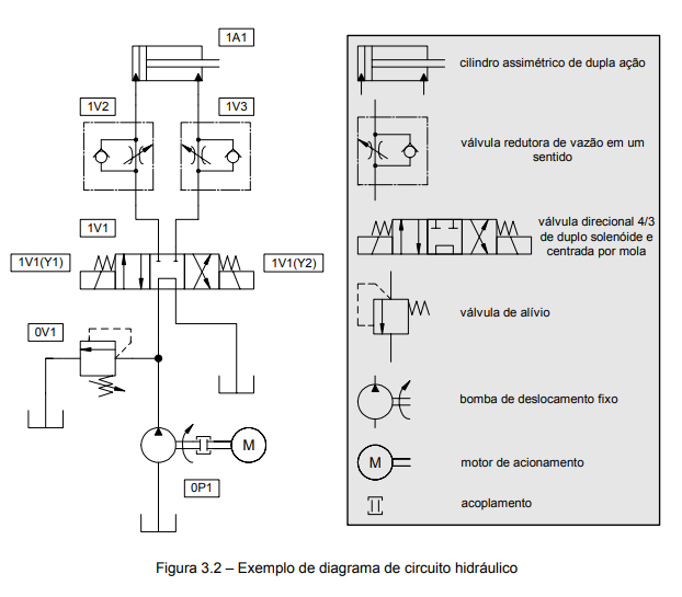 A primeira etapa de solução do problema resulta no diagrama de circuito hidráulico representado na figura 2.3, o qual emprega as recomendações das normas ISO 1219-1 (ISO, 1985) e ISO 1219-2 (ISO, 1995) para a representação de símbolos funcionais e de suas interligações. Este tipo de diagrama não considera o arranjo físico dos equipamentos na instalação e deve possibilitar o acompanhamento dos circuitos para todos os movimentos e comandos através das diferentes sequências de um ciclo de trabalho.