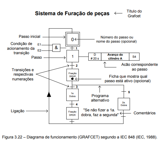 Na figura 3.23 apresenta-se um exemplo de Grafcet, equivalente ao diagrama trajeto-passo mostrado, descrevendo uma sequência em que os cilindros devem ser avançados e recuados. A partir deste diagrama é possível obter um programa completamente estruturado a ser implementado em um CLP.