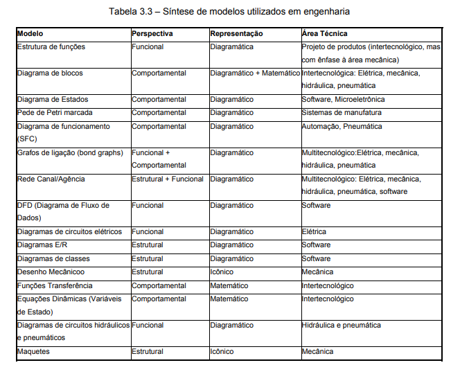 A tabela 3.3 apresenta diversos modelos empregados na descrição de sistemas no âmbito das engenharias mecânica, elétrica e de software.