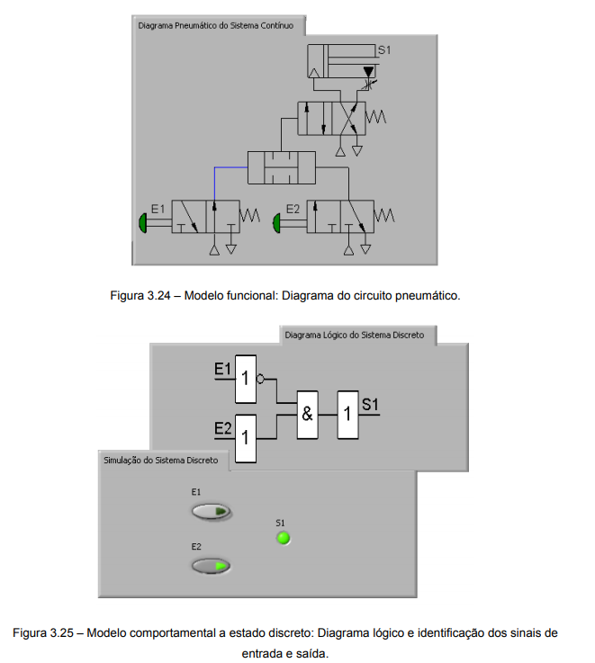 As figuras apresentadas nesta seção foram extraídas de um aplicativo desenvolvido com o software LABVIEW no qual é possível simular a operação sob o ponto de vista de sistema a eventos discretos e de sistema contínuo no tempo. Complementarmente, o circuito pneumático pode ser montado em uma bancada didática a fim da observação destes comportamentos em condições reais.