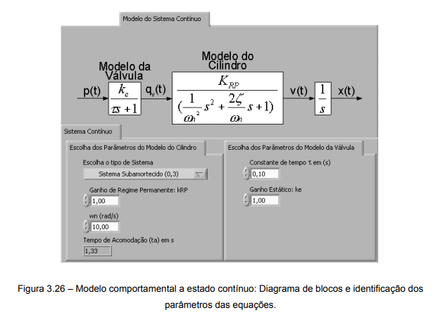 Porém, sabe-se que o acionamento de um cilindro não ocorre de forma instantânea. A partir do momento em há o sinal em pressão para o comando da válvula direcional principal, haverá um certo atraso até que a válvula abra totalmente. Este atraso está modelado através do primeiro bloco na figura 3.26. Por sua vez, o deslocamento do cilindro a partir da posição recuada até a posição avançada ocorre durante uma fração de segundos, ou mesmo em alguns segundos, em decorrência da compressibilidade do ar nas câmaras do cilindro e tubulações e também devido ao efeito da massa e do atrito junto ao êmbolo. O segundo bloco da figura 3.26 representa matematicamente o comportamento do cilindro.