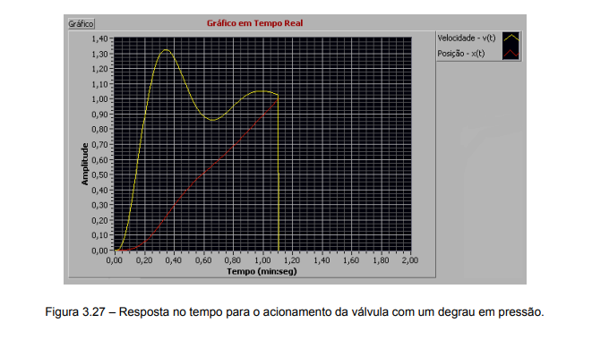 A resposta do cilindro no tempo pode ser observada na figura 3.27 onde a velocidade do êmbolo parte de zero e, após algumas oscilações, tende a um valor constante. Consequentemente, o deslocamento cresce continuamente até atingir o final de curso.