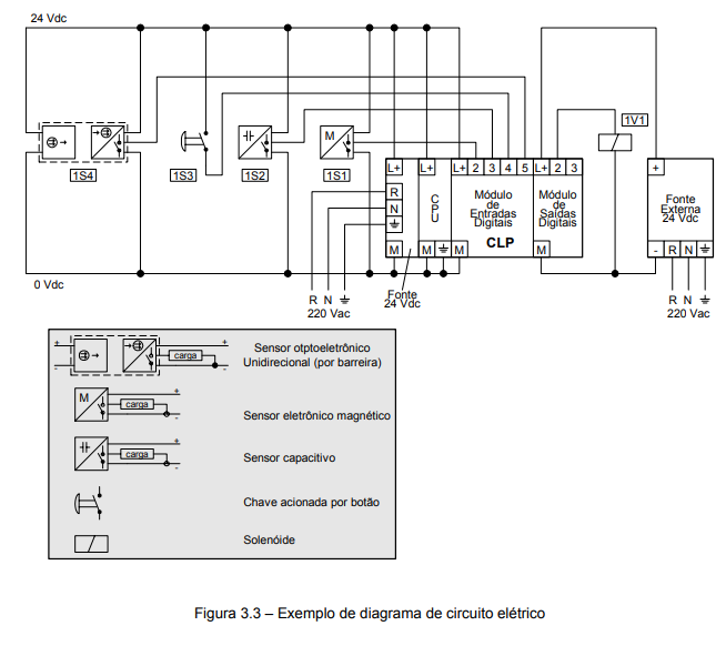 • Controlador lógico programável CLP: Acionar o solenoide 1S1 de acordo com o programa implementado e o estado dos sensores;