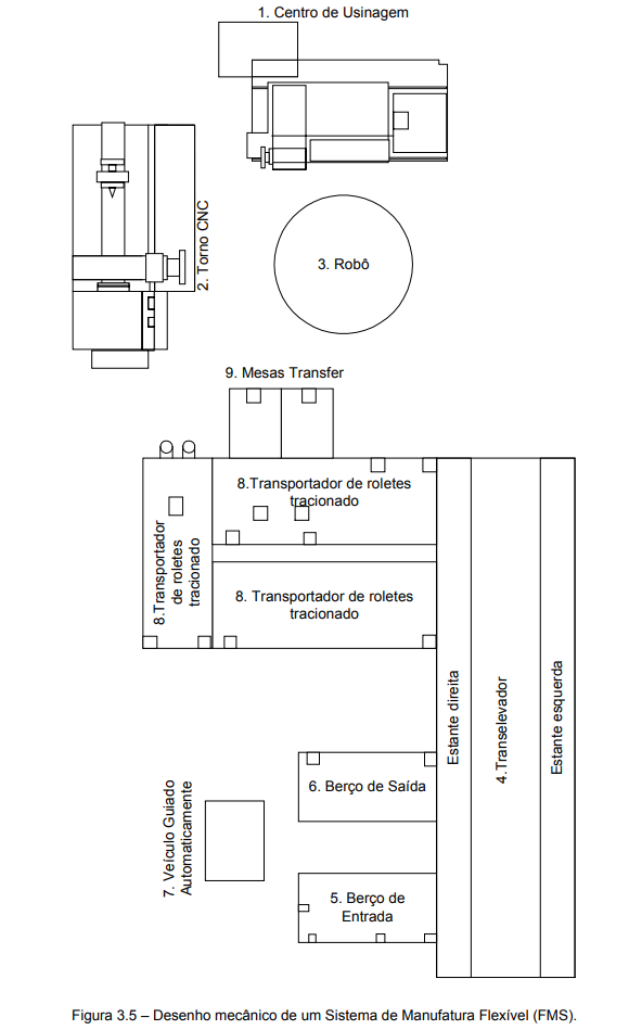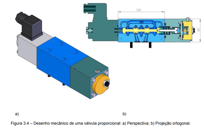 Como exemplos, na figura 3.4 tem-se uma perspectiva e uma projeção ortogonal de uma válvula direcional proporcional e na figura 3.5 a vista superior de um sistema de manufatura flexível.