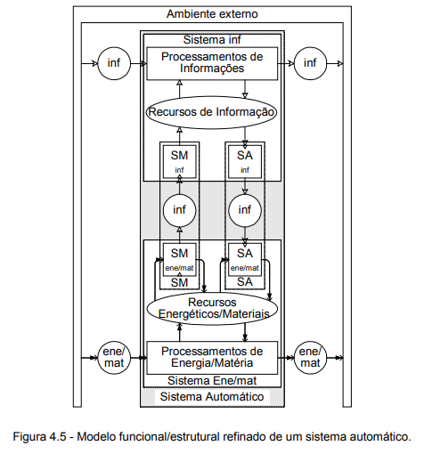 O refinamento da figura 4.4 dá origem ao modelo funcional/estrutural de um sistema automático (figura 4.5) em que são evidenciados os sistemas de medição (SM) e de atuação (SA) que concretizam o fluxo de informações interno. Estes sistemas são os únicos que possuem tanto fluxo energético e/ou material como de informação em suas fronteiras.