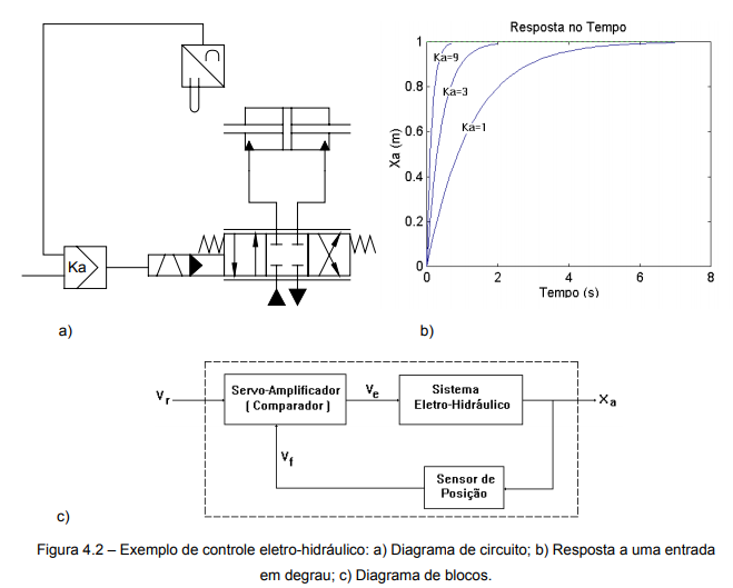 A figura 4.2 apresenta vários aspectos de um sistema de controle eletro-hidráulico composto de uma Servo válvula, um cilindro hidráulico de duplo efeito, um sistema de medição de posição e um controlador proporcional.