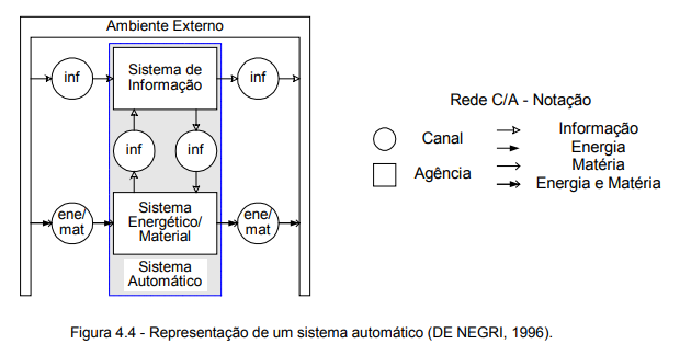Assim, conforme indicado na figura 4.4, o sistema de informação deve ser capaz de extrair informações da parte energético/material, processá-las e, posteriormente, utilizá-las para alterar o funcionamento deste. Além da troca de informações entre estes dois subsistemas, há também o recebimento e fornecimento de energia (ene), matéria (mat) e informação (inf) em relação ao ambiente externo.