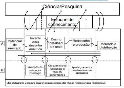 O processo inovativo, altamente complexo e incerto e envolvendo uma diversidade de agentes é discutido também por Kline e Rosenberg (1986), que desenvolveram o “modelo interativo” de inovação (figura 3) – que é adotado pelo Manual de Oslo (OCDE, 2005). Este modelo concebe a inovação em termos da interação entre oportunidades de mercado (que podemos associar ao advento das novas tecnologias de rede) e a base de conhecimento e capacitações das empresas. Cada função geral descrita na figura 3 envolve vários sub-processos com resultados altamente incertos. À medida que as TICs são beneficiadas pelos avanços da pesquisa científica, a ciência também se beneficia com as melhorias proporcionadas por elas e, com isso, seu uso se torna extensivo e intensivo, resultando em mais eficiência e mais inovação. O modelo pressupõe a existência de feedbacks (representados pelas setas) nas diversas fases da concepção de uma nova tecnologia, ou seja, há uma relação permanente entre a empresa e a estrutura de ciência, tecnologia e inovação (CT&I).