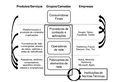 Segundo o autor, as TICs são compostas por quatro grupos fundamentais divididos em camadas e a inovação é decorrente das relações simbióticas entre elas (algumas sumarizadas pelas setas laterais da figura 2). A eles acrescentamos as instituições de normatização (um ator adicional) que representa um conjunto de interesses diversos (governos, empresas, etc) e descreve com mais detalhe o ecossistema que este estudo procura caracterizar. Nessas relações, as soluções fornecidas devem ser constantemente melhoradas, modernizadas e atualizadas, implicando em geração e acumulação de conhecimento e, ao mesmo tempo, em inovação não desprezível.