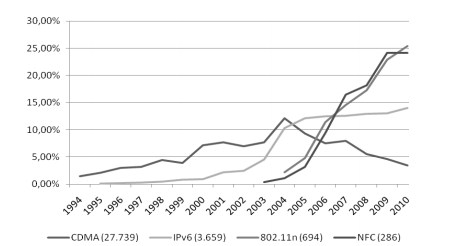 Duas tecnologias (802.11n e NFC), por um lado, e a iminente maturidade da tecnologia IPv6 (redução do crescimento) e o ocaso da CDMA (taxa negativa), por outro. Se o aparecimento de publicações das duas primeiras tecnologias permite caracterizá-las como “nas etapas iniciais da pesquisa”, o número de publicações das duas últimas reafirma aspectos relacionados à teoria discutida nos itens anteriores. Mesmo não sendo novas, as tecnologias para internet (IPv6 ou outras soluções ainda por derivar) se mantêm como um componente necessário aos novos produtos, fato que exige aperfeiçoamentos e/ou desenvolvimentos que garantem certo nível de pesquisas que mantém a dinâmica inovativa, mesmo que em ritmo inferior ao de outras novas tecnologias – como era de se esperar. O mesmo não é válido para soluções que se tornam insuficientes frente às novas (possíveis) trajetórias tecnológicas, cujos esforços científicos são no sentido de substituí-las, como é o caso da CDMA em relação à 4G.