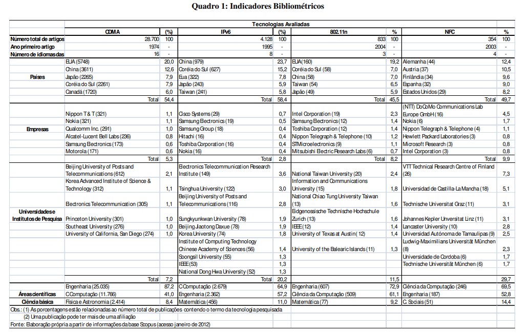 No conjunto, os critérios acima nos orientarão quanto ao caráter de novidade relativa das tecnologias selecionadas para, com isso, verificar sua dispersão global. Esses critérios também servem ao propósito de identificar a participação das empresas da amostra nos artigos científicos e com isso visualizar o avanço das trajetórias através da interação entre a ciência e tecnologia de diversas bases tecnológicas. Nascimento (2010) ressalta que vem se tornando relativamente mais influente a produção de artigos brasileiros na área de telecomunicações, embora essa produção seja relativamente marginal quando comparada à de países tradicionais em termos de gasto privado em P&D no complexo das TICs