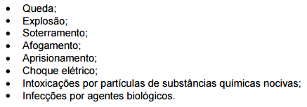 Os principais acidentes em espaços confinados são os riscos atmosféricos, químicos, físicos, biológicos, mecânicos, elétricos e ergonômicos (KULCSAR NETO; POSSEBON; AMARAL, [200-?b]).