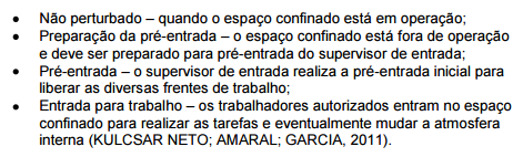 De acordo com Kulcsar Neto, Amaral e Garcia (2011), os espaços confinados possuem 4 (quatro) fases: