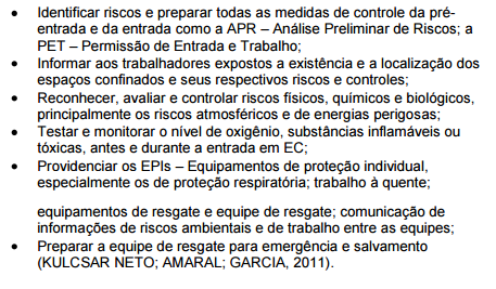 O empregador deve elaborar e implantar procedimentos de emergência e resgate adequados ao espaço confinado e os trabalhadores devem ser treinados para essas situações (KULCSAR NETO; AMARAL; GARCIA, 2011).