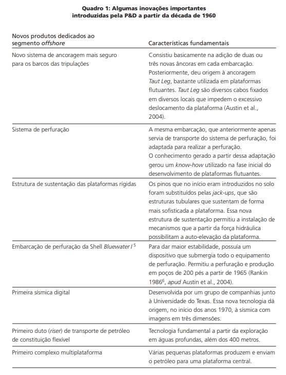 Algumas inovações incrementais importantes surgiram (quadro 1), de forma que, ao longo do tempo e no conjunto, a Humble Oil conseguiu, em 1957, alcançar a exploração de 100 pés (33 metros) de profundidade. Essas inovações ilustram a forte ênfase dada à P&D em torno do segmento offshore. Em função desse intenso avanço tecnológico na década de 1960, a produção offshore chegou aos 127,6 milhões de barris (4,8% da produção total americana). Nesse período, a Shell já estava se tornando a principal player do Golfo, em função do domínio do maior nível de capacitação, decorrente dos diversos programas de pesquisa desenvolvidos em seus laboratórios, desde o desenvolvimento de embarcações até estudos paleontológicos.