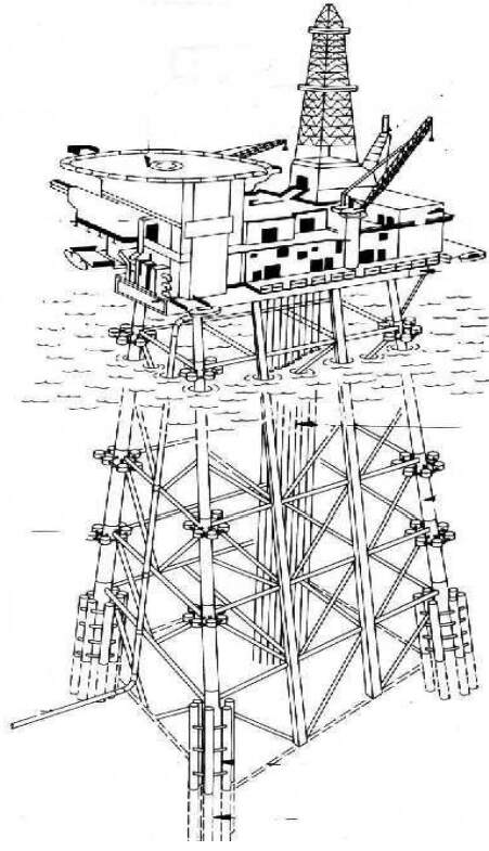 São estruturas utilizadas tanto para perfuração quanto produção de petróleo. Tem como principal característica uma estrutura de revestimento constituída por tubos de aço, por isso recebe o nome de jaqueta. É formada por uma estrutura treliçada e fixada no solo marinho através de estacas, possui geralmente de 4 a 8 pés fixos para alcançar a estabilidade contra a força de ondas. A FIGURA 2.1 mostra o esquema da estrutura de uma plataforma fixa do tipo Jaqueta. O óleo produzido é escoado diretamente para terra através de dutos ou podem ser utilizados navios acoplados à plataforma. Porém, esta não é a forma mais utilizada.