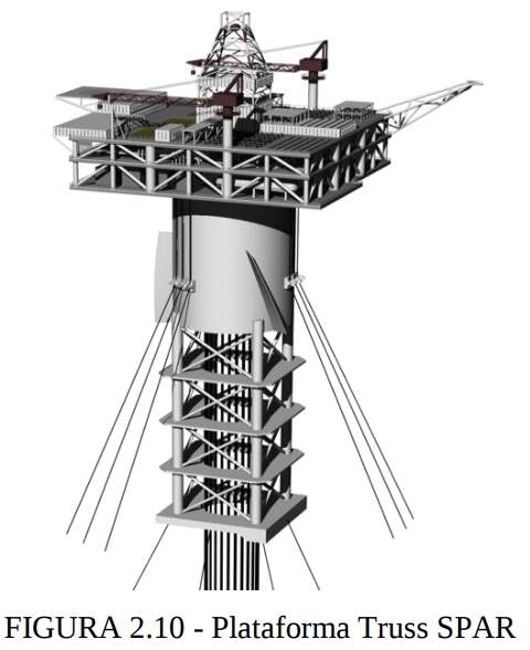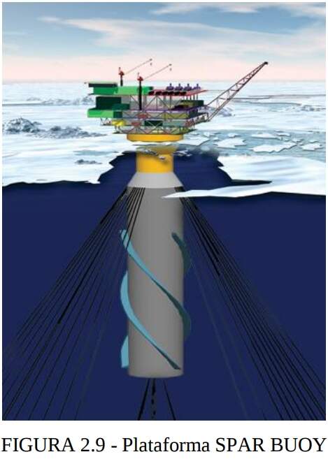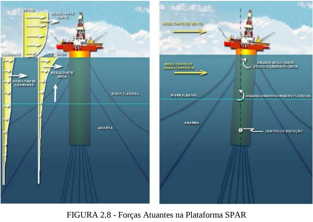 As plataformas SPAR são utilizadas para exploração em águas profundas, em torno de 1650 metros. Possui maior estabilidade do que as plataformas citadas anteriormente, gerando poucos movimentos verticais, devido ao tamanho do calado da plataforma, a resultante de vento, de corrente e onda não conseguem deslocar significamente o centro de rotação, possibilitando desta forma uma diminuição dos efeitos de onda e movimentos verticais, conforme mostra a FIGURA 2.8. Isso possibilita não só o uso de risers rígidos de produção como também a completação seca. Estas plataformas têm como principais características o calado de operação com cerca de 200 metros, o baixo custo, podendo utilizar um sistema de amarração convencional.