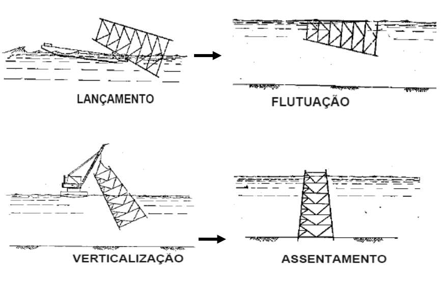 A operação inicia-se com o lançamento da estrutura treliçada ao mar, ocorre a flutuação da mesma, que é verticalizada através do içamento por guindastes flutuantes, a última etapa da operação é o assentamento no leito marinho por estacas que são cravadas no solo.
