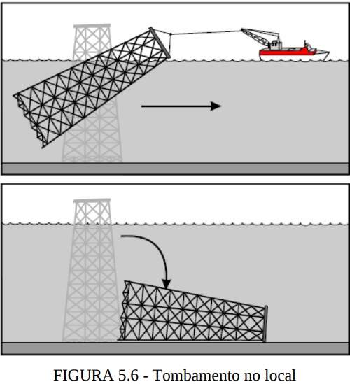 Este processo de descomissionamento tem como primeiro passo a remoção da planta de processo, que será mais bem detalhada mais a frente no trabalho. Em seguida é feito o tombamento de toda a estrutura no local. Contudo, esta opção é bem complexa, devido ao elevado grau de precisão e controle necessários para a operação. São utilizados explosivos para, de forma controlada, secionar os membros críticos da estrutura e, então, o tombamento ocorra, com auxílio de rebocadores e também pelo próprio peso da estrutura.