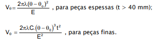 • A velocidade de resfriamento varia inversamente com a energia de soldagem, isto é, quanto menor a energia de soldagem maior a velocidade de resfriamento. A influência da energia de soldagem na velocidade de resfriamento é maior em espessuras finas.