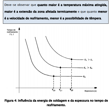 • A velocidade de resfriamento varia diretamente com a espessura da peça que está sendo soldada, isto é, quanto maior a espessura maior a velocidade de resfriamento. Entretanto, a variação tem um limite. A partir de uma determinada velocidade de resfriamento, por mais que se aumente a espessura, a velocidade de resfriamento não se altera. A velocidade de resfriamento limite varia com a energia de soldagem (ver figura 4).
