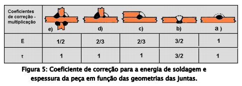 • A velocidade de resfriamento varia com a forma geométrica das peças. A figura 5 mostra os coeficientes de correção para a energia de soldagem e a espessura da peça a serem empregados no cálculo da velocidade de resfriamento, em função da geometria das juntas.
