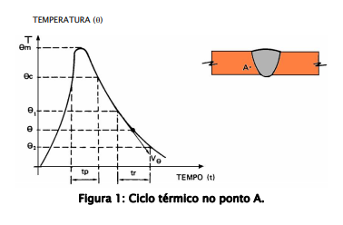 Considere um ponto da junta soldada, definido pela sua distância ao centro da solda e pela sua posição em relação à espessura. O calor da operação de soldagem provoca, neste ponto, variações de temperatura como indica a figura 1.