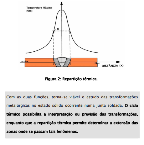 Analisando todos os pontos, é possível se obter as temperaturas máximas atingidas em função da distância ao centro da solda θm = f(x) (figura 2). Esta função é a repartição térmica para a reta considerada (no centro da solda). Estabelecido o regime de soldagem, a repartição térmica mantém a sua forma ao longo do cordão de solda.