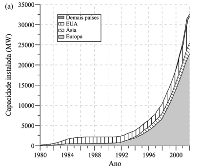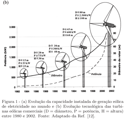 A evolução da capacidade instalada de geração eólica de eletricidade no mundo e a evolução tecnológica dos aerogeradores entre 1980 e 2002 podem ser observadas nas Figs. 1a e 1b, respectivamente. Desde o início da década de 1990 o setor de energia eólica vem apresentando um crescimento acelerado em todo o mundo. A capacidade instalada total mundial de aerogeradores voltados à produção de energia elétrica atingiu 74223 MW ao final de 2006, apresentando um crescimento de mais de 20% em relação a 2005. Segundo o Global Wind Energy Council [15], esse crescimento de capacidade instalada ao longo de 2006 representa o maior acréscimo observado ao longo de um ano. Ainda segundo o GWEC [15], o Brasil totalizou a inserção de 208 MW ao longo de 2006, fechando o ano com 237 MW de capacidade instalada. Esse acréscimo deve-se em grande parte à instalação dos parques eólicos de Osório (RS) que totalizam 150 MW. Este complexo eólico conta com 75 aerogeradores de 2 MW cada um, instalados em três parques eólicos, com capacidade de produzir 417 GWh por ano.