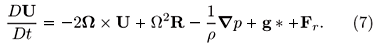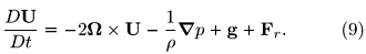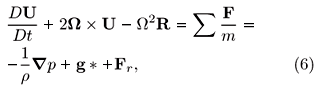 onde D U / Dt é a taxa de variação da velocidade, referente ao sistema de coordenadas fixo à superfície da Terra e seguindo o movimento da parcela de ar, U = uî + v img01 + w img2é o vetor velocidade nestas mesmas coordenadas, Wé o vetor velocidade angular da rotação da Terra cujo módulo é representado por W, e R é um vetor de posição, perpendicular ao eixo de rotação da Terra e com comprimento igual à distância entre o eixo de rotação e a parcela de ar. O operador D / Dt, denominado derivada total, representa a taxa de variação de uma propriedade de uma parcela de fluido seguindo o movimento da mesma.