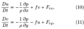 Adicionalmente, parcelas de fluido em movimento sofrem a ação de fricções internas que resistem à tendência do escoamento (forças viscosas resistivas ou atrito), representadas por Fr. Considerando uma parcela individual de ar, com massa constante, que se move ao longo da atmosfera seguindo o escoamento, e tomando um sistema de coordenadas inercial, fixo no espaço, a segunda lei de Newton pode ser escrita como