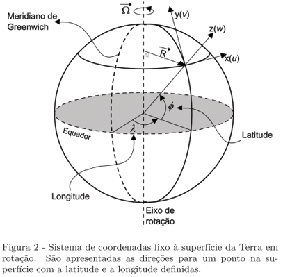 Entretanto, no estudo da dinâmica dos movimentos atmosféricos, usualmente adota-se um sistema de coordenadas fixo à superfície terrestre, como mostra a Fig. 2. Este sistema é composto pelas direções zonal (eixo x) e meridional (eixo y) - paralelas à superfície do planeta - e pela direção vertical (eixo z) perpendicular à superfície. Assim, o vento horizontal apresenta duas componentes: o vento zonal que está simbolizado por u e é positivo no sentido de oeste para leste; e o vento meridional representado por v e positivo no sentido de sul para norte. O movimento do ar na vertical é normalmente representado por w, assumindo-se valores positivos para movimentos ascendentes.