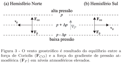 Em níveis atmosféricos afastados da superfície terrestre, o atrito pode ser desprezado e o vento pode ser descrito pelo equilíbrio entre a força de Coriolis e do gradiente de pressão, sendo essa aproximação chamada de aproximação geostrófica. As parcelas de ar inicialmente em repouso e sujeitas a um gradiente de pressão, começam a acelerar-se em direção à pressão mais baixa. A força de Coriolis cresce à medida que a velocidade aumenta fazendo com que as parcelas de ar sejam gradativamente defletidas até que, eventualmente, as duas forças entrem em equilíbrio e as parcelas passam a mover-se perpendicularmente ao gradiente de pressão e paralelamente às isóbaras (isolinhas de pressão constante), com velocidade constante e em trajetórias retilíneas, como mostradas na Fig. 3. Como a força de Coriolis desvia as trajetórias de ar para a direita no Hemisfério Norte e para a esquerda no Hemisfério Sul, o vento em equilíbrio resultante, para uma mesma distribuição de pressão, possui sentidos opostos em cada hemisfério. Esse movimento não-acelerado e retilíneo das parcelas de ar possui intensidade proporcional à intensidade dos gradientes de pressão, e é denominado vento geostrófico.