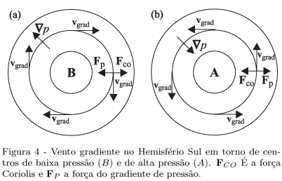 O vento gradiente também é paralelo às isóbaras curvilíneas, à custa de um desequilíbrio entre as forças de Coriolis e do gradiente de pressão, que resulta em uma aceleração centrípeta, responsável pela curvatura das parcelas de ar em torno das células de alta e baixa pressão. Isso é exemplificado na Fig. 4 para o Hemisfério Sul, onde o vento escoa no sentido horário em torno das baixas pressões e em sentido anti-horário em torno das altas pressões (o oposto ocorre no Hemisfério Norte). As baixas pressões são comumente denominadas ciclones, enquanto altas pressões são denominadas anticiclones.