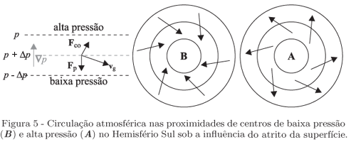 A rugosidade da superfície ocasiona a redução da velocidade do ar e, portanto, da intensidade da força de Coriolis, já que esta é proporcional ao módulo da velocidade. Conseqüentemente, o vento deixa de escoar paralelamente às isóbaras, como descrito anteriormente para o escoamento em altos níveis. Nas proximidades da superfície, o vento apresenta uma componente no sentido da força do gradiente de pressão. Dessa forma, o escoamento ciclônico converge em direção à baixa pressão, enquanto nos anticiclones o ar diverge, afastando-se do centro de alta pressão (Fig. 5). A convergência de ar provoca movimentos ascendentes sobre os centros de baixa pressão, ocasionando instabilidades e possibilitando formação de nuvens e chuva. Nos centros de alta pressão ocorrem movimentos descendentes de ar, e normalmente o tempo é bom e estável.