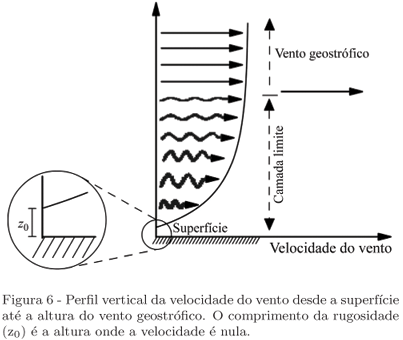 onde a variação da velocidade com a altura vertical z, é dada em função da velocidade de fricção (v*), da constante de von Karmán (k), e do comprimento de rugosidade (z0). O comprimento de rugosidade corresponde à altura em que o vento, próximo à superfície, assume valor zero, e depende do relevo e obstáculos da superfície. Contudo, o perfil real de velocidades na vertical depende também da estratificação de temperatura e pressão na atmosfera.