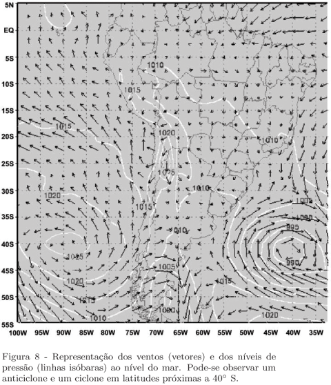 Os anticiclones e ciclones extratropicais, com suas frentes frias e quentes, são sistemas sinóticos que além de responsáveis pelas mudanças nas condições de tempo (nebulosidade, precipitação, tempestades e mudanças bruscas de temperatura) nas latitudes médias, também provocam variações nas intensidades e direções dos ventos nos altos e baixos níveis atmosféricos. A Fig. 8 apresenta, para um nível próximo à superfície, uma sobreposição de um mapa de pressão e um mapa de vento (representado através de vetores), onde se pode observar um anticiclone (giro anti-horário no hemisfério sul) e um ciclone (giro horário no hemisfério sul) e o vento associado.