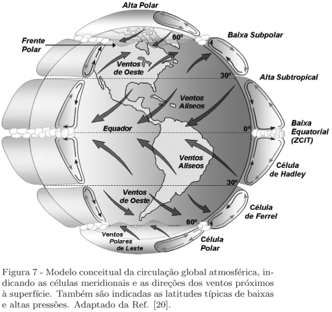 Os movimentos de escala planetária são primariamente causados pelo aquecimento diferencial da superfície terrestre, em que a irradiação solar incide com maior intensidade nas regiões próximas ao Equador. Os movimentos que surgem a partir de então agem para promover uma redistribuição de calor (transporte de ar quente para os pólos e ar frio para o Equador, diminuindo as desigualdades térmicas). Além disso, deve-se ter em mente, que devido ao movimento de rotação da Terra, a circulação atmosférica planetária é influenciada pela conservação do momento do sistema Terra-Atmosfera. A Fig. 7 apresenta um modelo conceitual de circulação atmosférica planetária chamado de modelo de três células. Neste modelo, a circulação em cada hemisfério é descrita por três células meridionais de circulação, cada qual apresentando direções de vento predominantes à superfície. Apesar de algumas limitações, este modelo é considerado o melhor modelo simples da circulação global atmosférica.