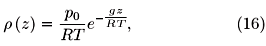 onde r(z) é a densidade do ar (em kg/m3) em função da altitude z, p0 é a pressão atmosférica ao nível do mar (em kg/m3), T é a temperatura do ar (em K), g é a aceleração da gravidade (em m/s2) e R é a constante específica do ar (em J/K mol).
