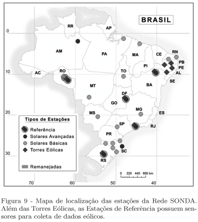 No Brasil, o CPTEC/INPE opera e gerencia uma rede de coleta de dados de vento e dados ambientais voltada para atender a demanda por informações do setor energético - Rede SONDA. O objetivo principal da rede SONDA e disponibilizar informações que permitam o aperfeiçoamento e validação de modelos numéricos para estimativa de potencial energético de fontes renováveis. A Fig. 9 apresenta a localização das estações de coleta de dados eólicos com anemômetros e termômetros instalados a 25 m e 50 m do solo. Maiores detalhes sobre a Rede SONDA, bem como acesso livre a toda a base de dados coletados podem ser obtidos em www.cptec.inpe.br/sonda. O CPTEC/INPE também disponibiliza acesso à base de dados coletados em estações automáticas (não direcionados especificamente ao setor de energia).